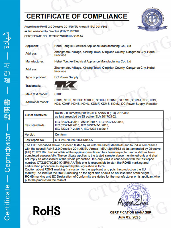 ООО Хэбэй Тонгке по производству электрооборудования — это технологическое предприятие, специализирующееся на проектировании, разработке, производстве и продаже мощных импульсных источников питания. Основанная в 2001 году, компания обладает более чем двадцатилетним опытом работы в отрасли и накопленными техническими знаниями, а качество нашей продукции находится в числе лучших в стране. Наша продукция охватывает множество категорий, включая источники постоянного тока, выпрямители, источники переменного тока, высокочастотные импульсные источники питания, импульсные источники питания, распределительные шкафы, электронные корпуса, а также различные источники питания для отраслевого применения, такие как источники питания для очистки воды, источники питания для электродиализа, источники питания для электрофлокуляции, источники питания для гальваники, источники питания для электрофореза, источники питания для оксидирования, источники питания для электролиза, источники питания для электролитического производства водорода из воды, источники питания для электролитического производства фтора из фтористого водорода, источники питания для производства электролитической медной фольги, источники питания для выплавки редкоземельных металлов, источники питания для электроэкстракции меди, источники питания для нагрева, испытательные источники питания и источники питания для зарядки аккумуляторов.